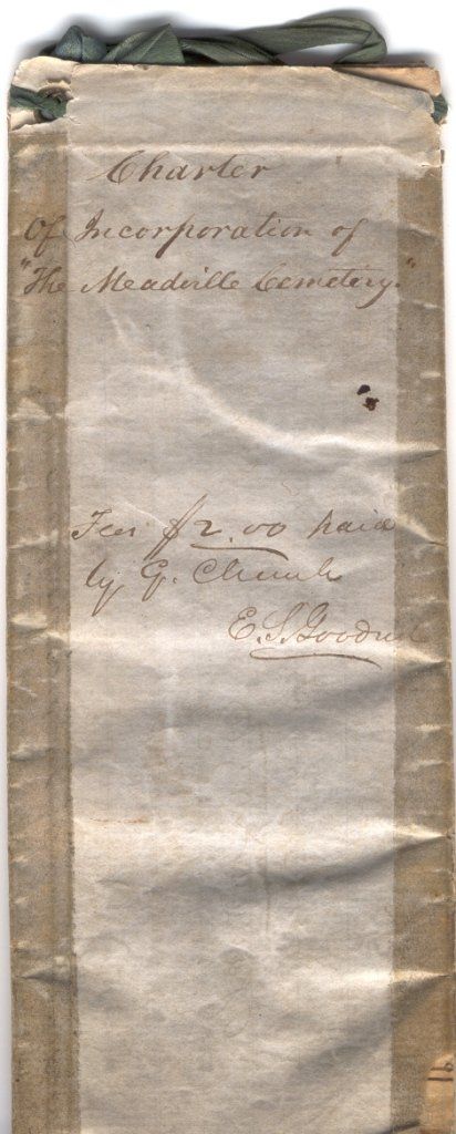 On March 11, 1852 the remains in the Randolph Street Cemetery were disinterred and moved to the present day location. Though they were placed in one large grave, the individual grave markers were also moved and may be found in a central section of Greendale. The original charter from the Pennsylvania House of Representatives still exists. You can view the document's outside, or you can view the inside.