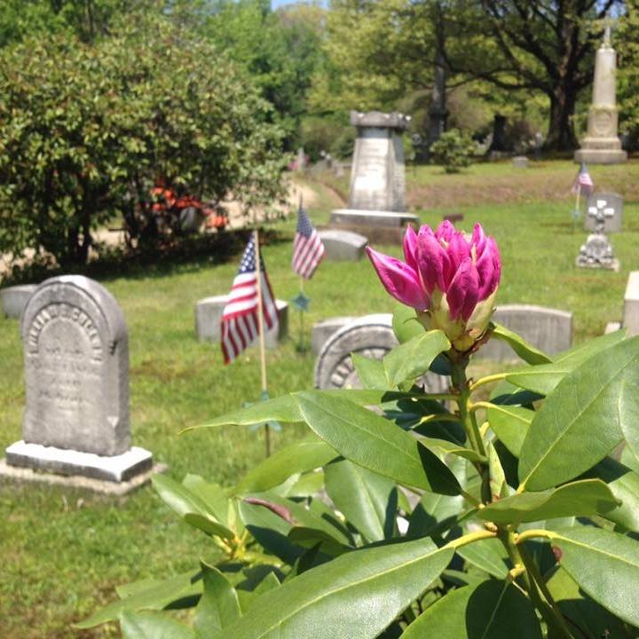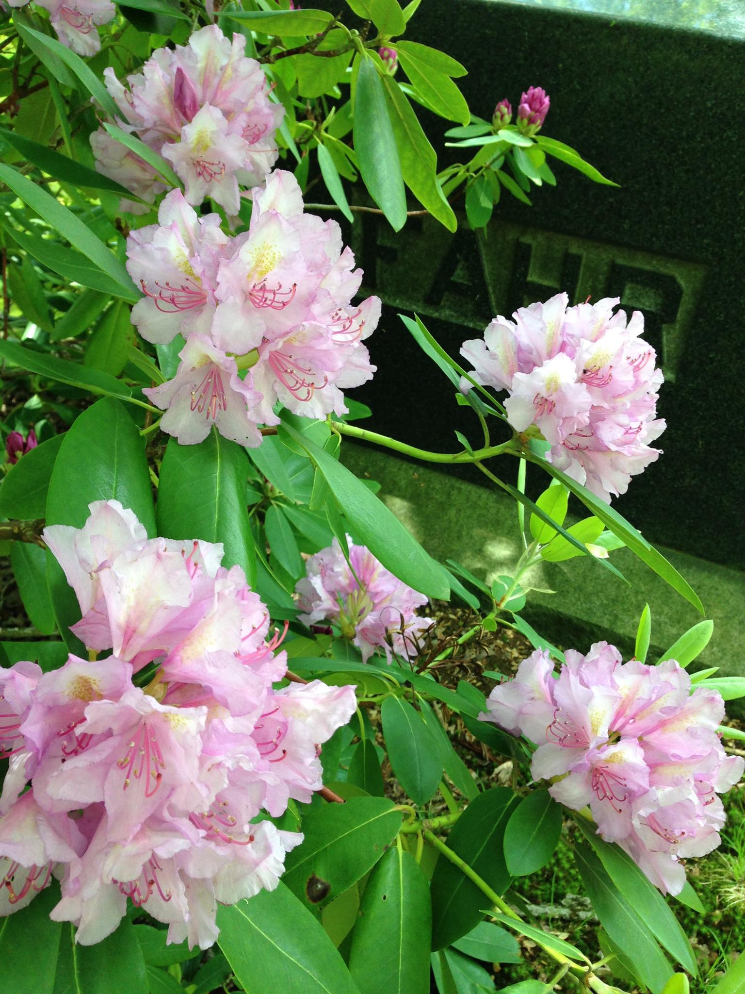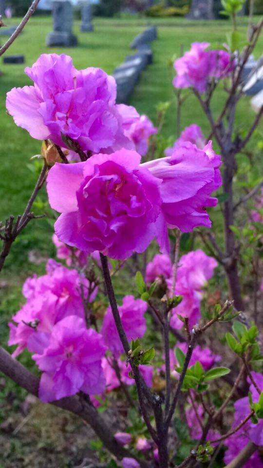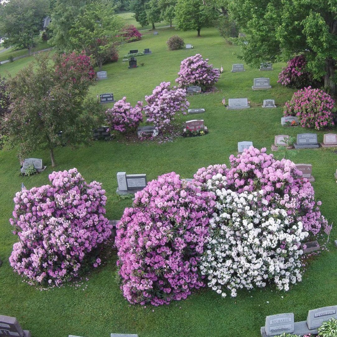 In 1875 Herman Munz was hired to plant the grounds, and today over 1500 rhododendrons decorate the grounds. During "Rhodie" season, people drive from miles away to see the gorgeous array of blossoms. The crew plants geraniums on hundreds of grave sites. There are countless species of trees, shrubs, bushes and other flora.