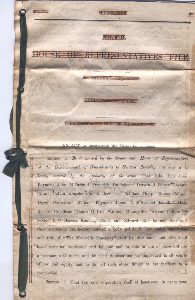 On March 11, 1852 the remains in the Randolph Street Cemetery were disinterred and moved to the present day location. Though they were placed in one large grave, the individual grave markers were also moved and may be found in a central section of Greendale. The original charter from the Pennsylvania House of Representatives still exists. You can view the document's outside, or you can view the inside.